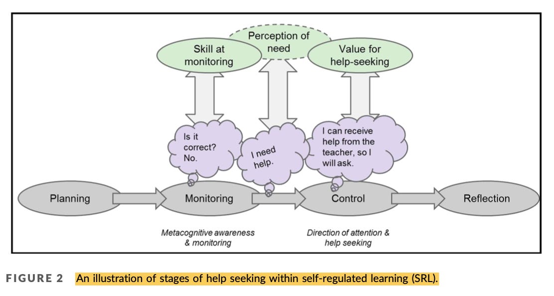 From my perspective, the help-seeking literature has kind of stalled out. That’s surprising because student help-seeking is pretty darn important. Students need to have the skills to know when they need help, to seek the appropriate type of help, and to implement that help to not only complete a task but also update their knowledge and skill so they don’t need that particular type of help again in the future. For example, if a student is struggling to correctly use the Pythagorean Theorem for a problem, they need to the ability to metacognitively monitor when it’s clear they lack sufficient knowledge to solve problem (e.g., “okay, I’ve tried everything I know and I’m just not getting the right answer”), then they need to have adaptive beliefs about help-seeking (e.g,., “everybody needs help sometimes and it’s a good thing to seek help”) and what types to seek (e.g., “help-me-better-understand help, not just-give-me-the-answer help”), and then they need to use the help they sought to not only solve the problem they are struggling on but also to update their knowledge and skill in long-term memory so they won’t have the same struggles the next time they work on a similar problem. Clearly, there’s a lot to conceptualize, operationalize, model, and understand about help-seeking and how it relates to other student factors (e.g., motivation, strategy use, etc.) and contextual factors (e.g., classroom and other environmental messages about needing help, differences across academic domains, etc.). That’s why I was excited to see Rutherford et al’s (2023) study on help-seeking, wherein they posited and tested a new model of help-seeking with self-regulated learning (SRL).