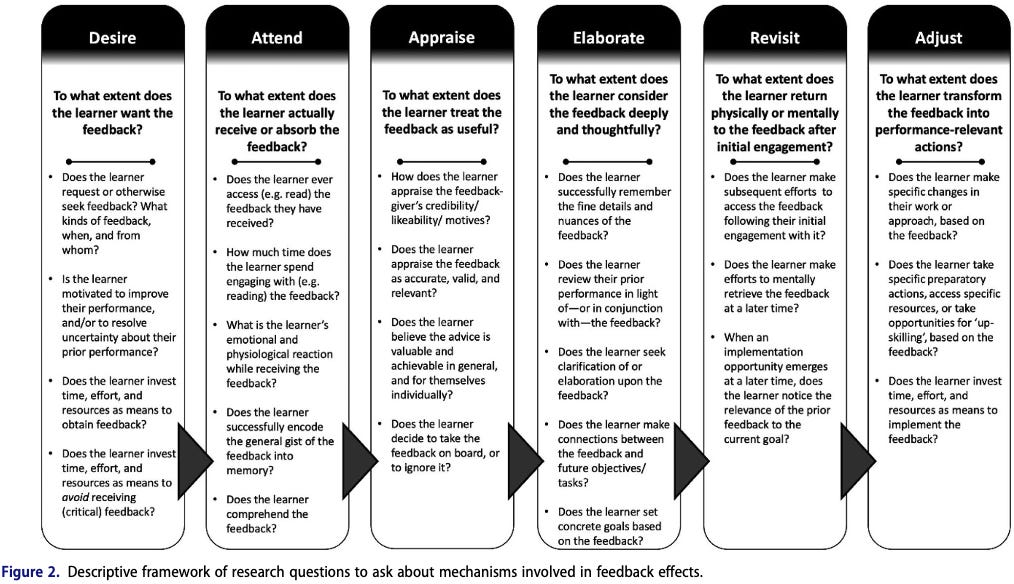 Basically, if you study feedback or want to do so, it’s a huge list of great research ideas. And Naomi and Rob unpack each phase, explaining how they derived it. They end with a description of each of the other articles in the special issue, which go into ideas from one or more of the phases.