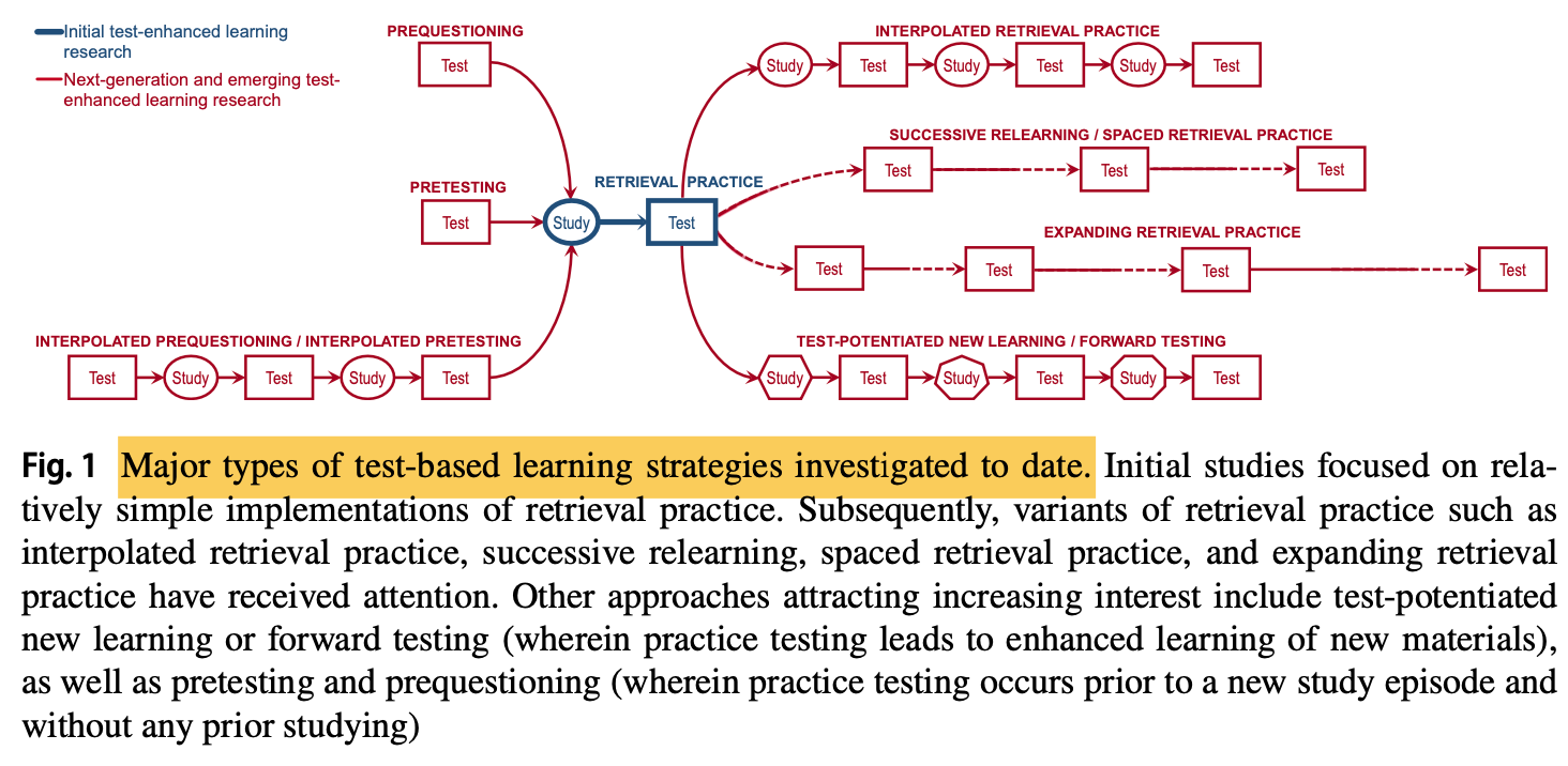 The articles in this topical collection are definitely worth checking out, and a good place to start is the guest editors' introduction (Pan et al., 2024). They provide a nice overview of the history of this area of scholarship, including a super helpful graphic that organizes and explains the various flavors of test-enhanced learning ideas: